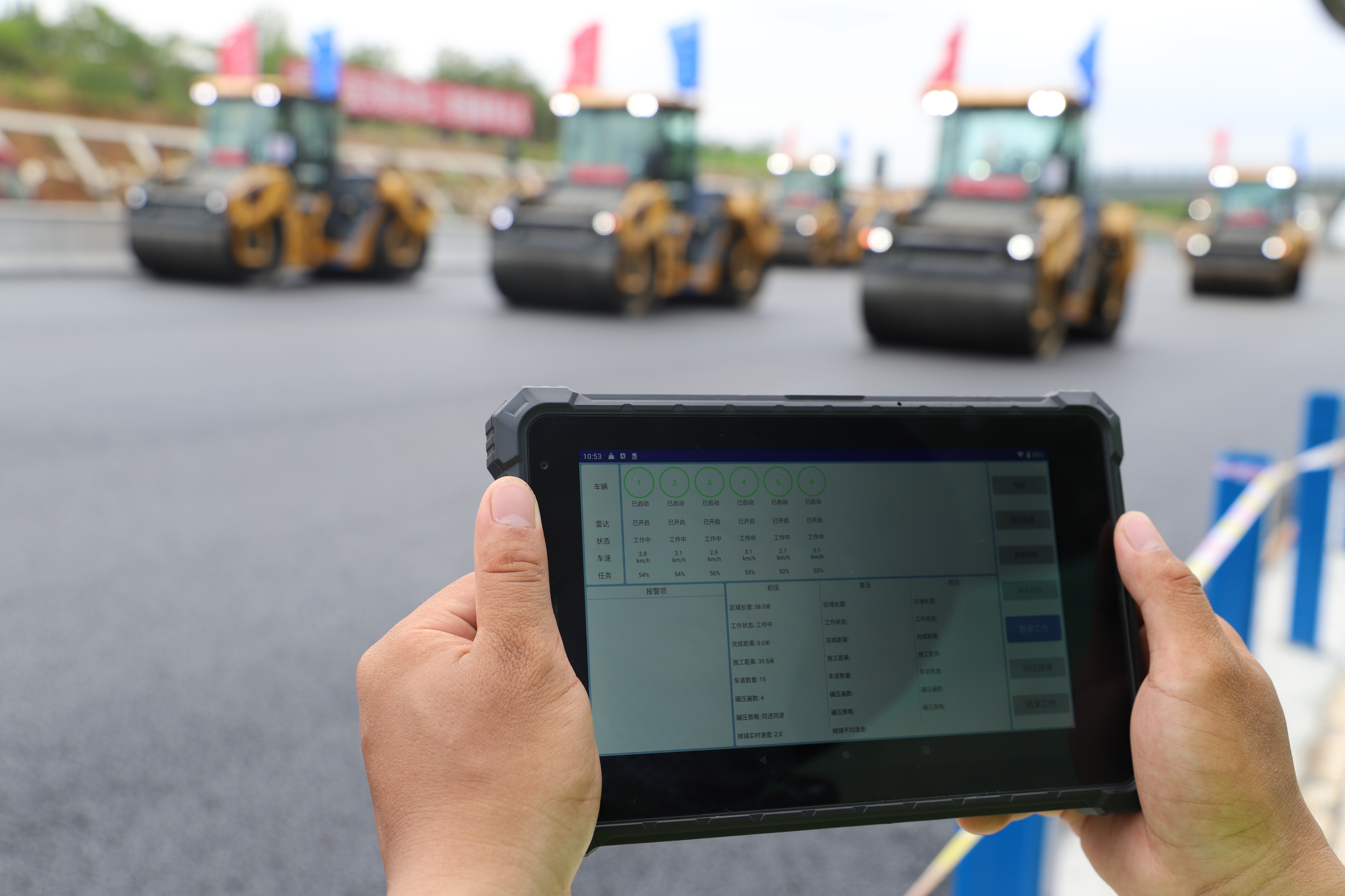 觀摩會(huì)現(xiàn)場(chǎng),智能攤鋪機(jī)在無(wú)人操作狀態(tài)下,與綠色自卸卡車精準(zhǔn)配合,高效完成右幅瀝青上面層攤鋪?zhàn)鳂I(yè)。緊隨其后,多臺(tái)無(wú)人駕駛壓路機(jī)以整齊陣列開(kāi)展協(xié)同碾壓,操作人員僅需一臺(tái)通過(guò)“北斗導(dǎo)航+智能算法”的手持設(shè)備便能實(shí)現(xiàn)施工全流程數(shù)字化管控。